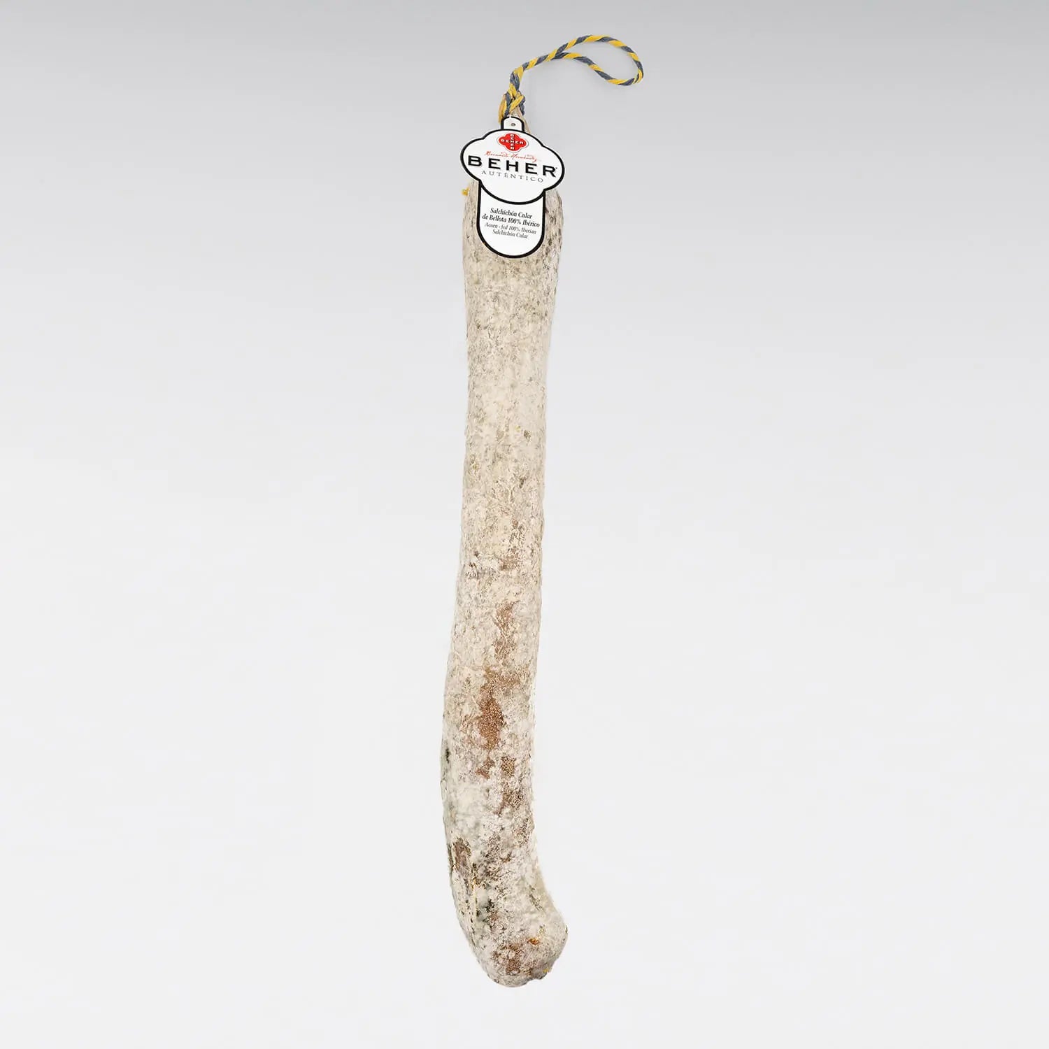 Elaborado exclusivamente con carne de cerdo ibérico alimentado de bellotas, este salchichón se cura durante 120 días en condiciones climáticas óptimas que favorecen el desarrollo de su sabor intenso y textura única.