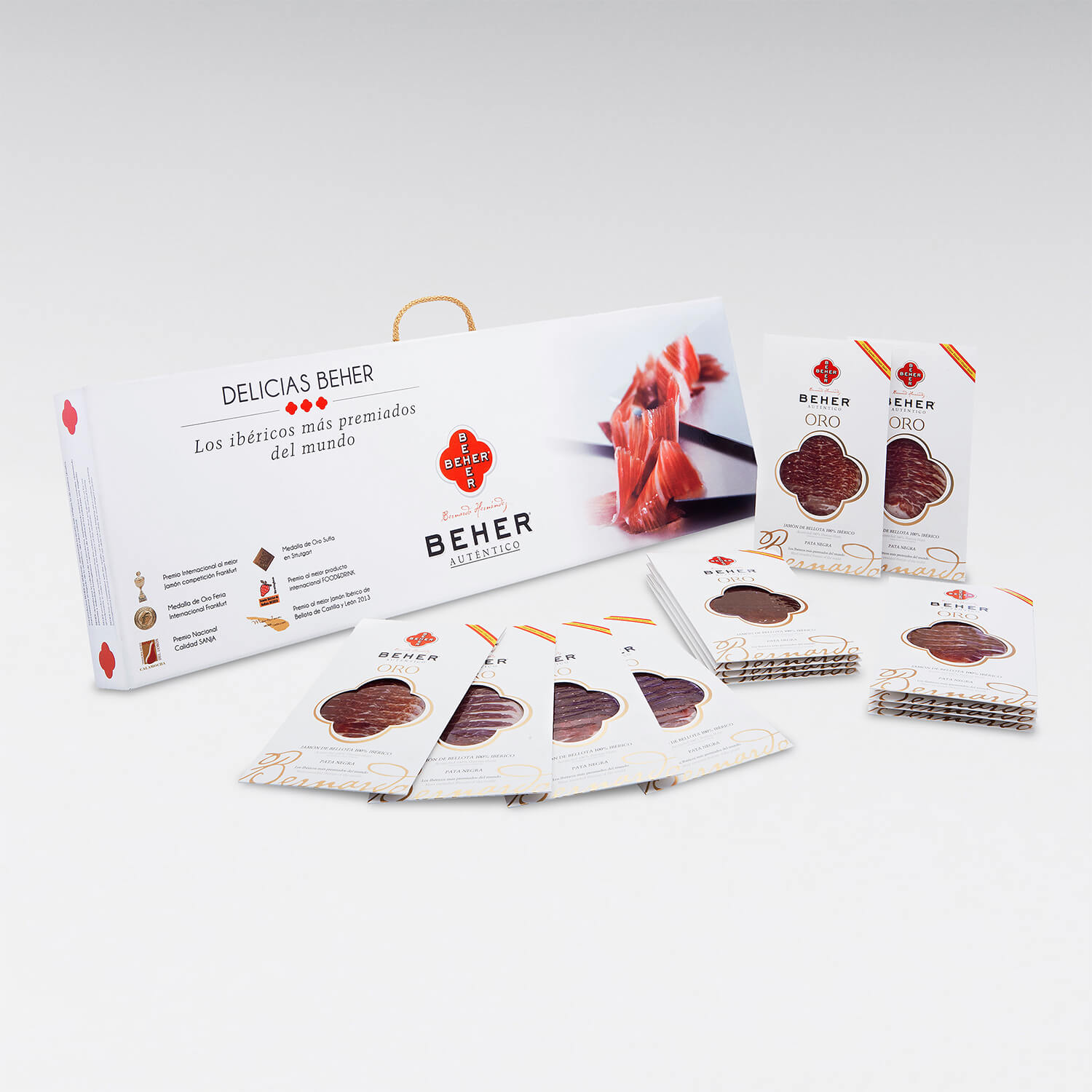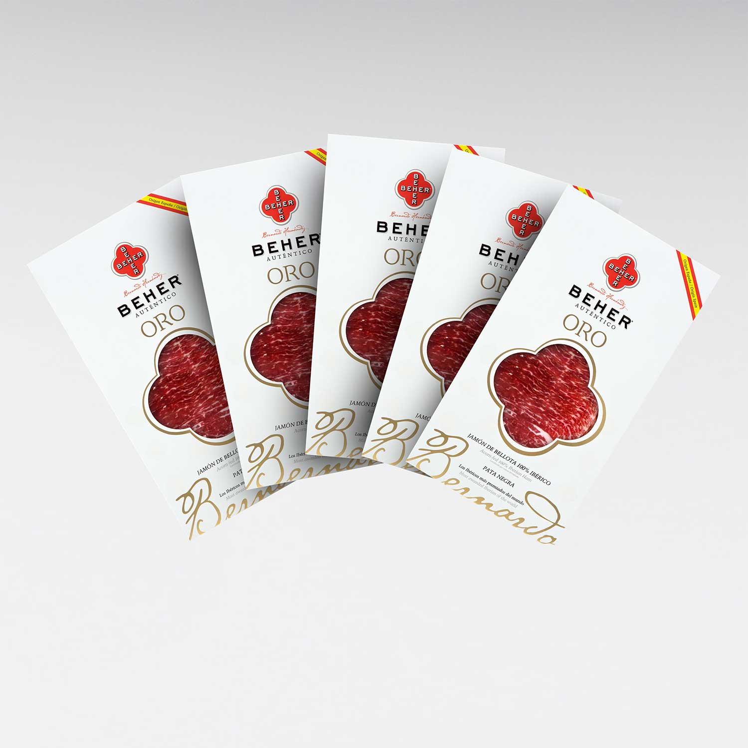 Disfruta de la excelencia del Jamón Oro BEHER, ahora en un formato práctico y listo para saborear. Este sobre contiene finas lonchas de jamón de bellota 100% ibérico "Pata Negra", obtenido de cerdos criados en libertad en nuestras fincas y alimentados con bellotas y pastos naturales.